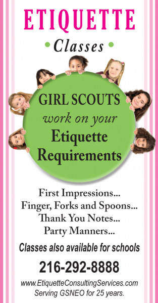 A full service, previous Girl Scout in her youth and Troop Leader for her daughters troop, this women owned Cleveland Etiquette training company has serviced GSNEO for over 23 years. Girl Scouts will earn their requirements towards several badges and patches. Programs are tailored to your troops needs. Original not franchised programs. Local media guest. Handouts and materials supplied. Has organized and planned GS programs since 1994.